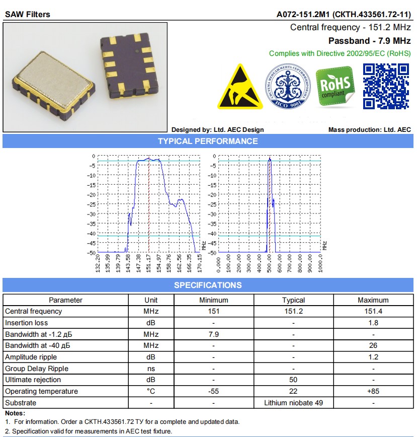 | Bandwidth at -40 дБ | MHz | - | - | 26 |