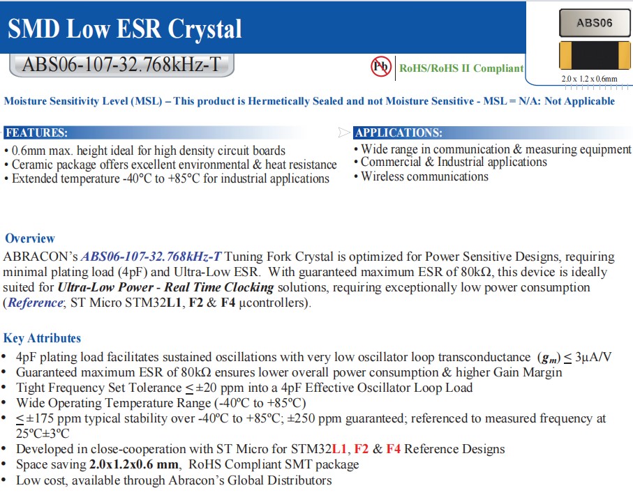 | ABS06-107-32.768KHZ-T | Abracon艾博康 | ABS06 | 32.768kHz | 2-SMD, No Lead |