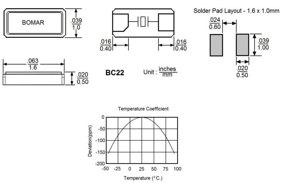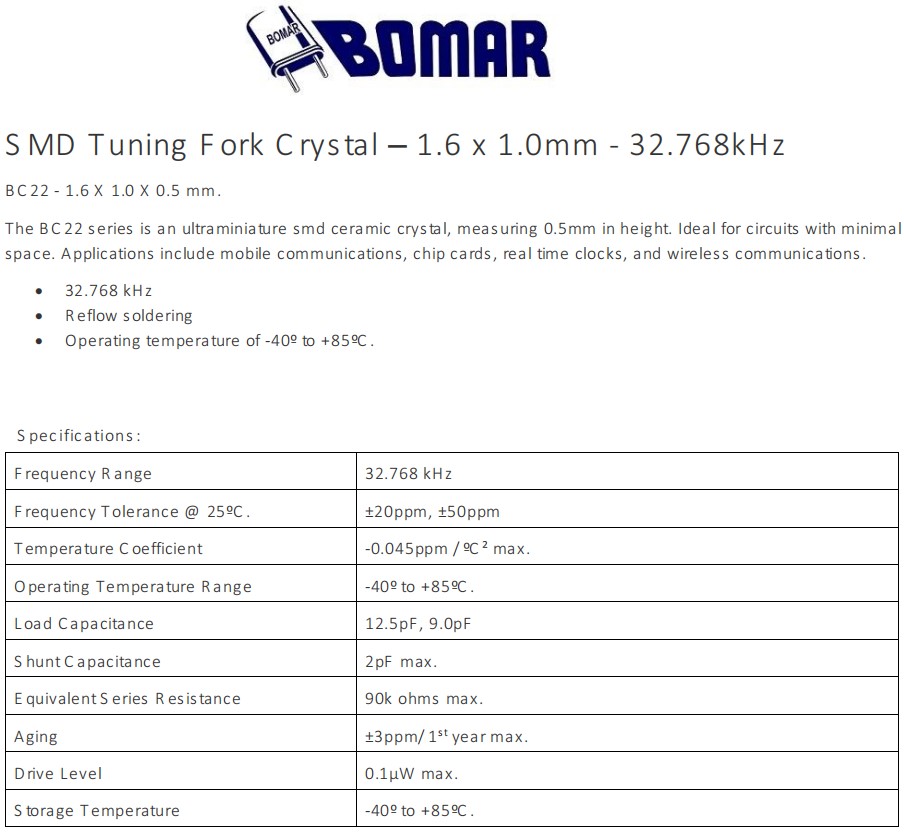 BC22CCI112.5-32.768K,1610mm,Bomar晶振,32.768KHz,BC22,實時時鐘晶振,美國進口晶振,Bomar博馬爾晶振,型號:BC22,編碼為:BC22CCI112.5-32.768K,負載:12.5pF,精度:±20ppm,頻率為:32.768KHz,工作溫度范圍:-40℃至+85℃。小體積晶振尺寸:1.6x1.0x0.5mm,兩腳貼片晶振,無源晶振,石英晶振,石英晶體諧振器,無鉛環保晶振,1610mm晶振,超小型晶振,輕薄型晶振。BC22系列是一種超薄的SMD石英晶振,高度為0.5毫米。非常適用于空間最小的電路。應用程序:移動通信、芯片卡、實時時鐘,無線通信,智能手機,儀器儀表設備,鐘表電子,時鐘晶振,平板電腦,數碼電子等應用。