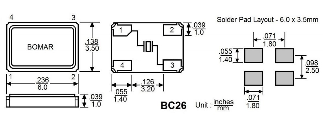 BC26EFD120-26.000000,6035mm,Bomar無源晶振,26MHz,BC26,汽車電子晶振,美國進口晶振,Bomar博馬爾晶振,型號:BC26,編碼為:BC26EFD120-26.000000,精度:±30ppm,頻率穩定性:±50ppm,工作溫度范圍:-20℃至+70℃,負載:20pF,頻率為:26.000MHz,小體積晶振尺寸:6.0x3.5x1.0mm陶瓷封裝,四腳貼片晶振,無源晶振,石英晶振,石英晶體諧振器,SMD晶振,6035晶振,超小型晶振,輕薄型晶振,無鉛環保晶振,BC26系列進口晶振是一個尺寸為6035mm的超薄金屬包。它的陶瓷底座和金屬覆蓋,它提供了耐久性和可靠性必要的艱苦過程,如紅外和氣相回流。應用程序:包括PMCIA、無線應用、汽車電子、通信設備,測試設備等。