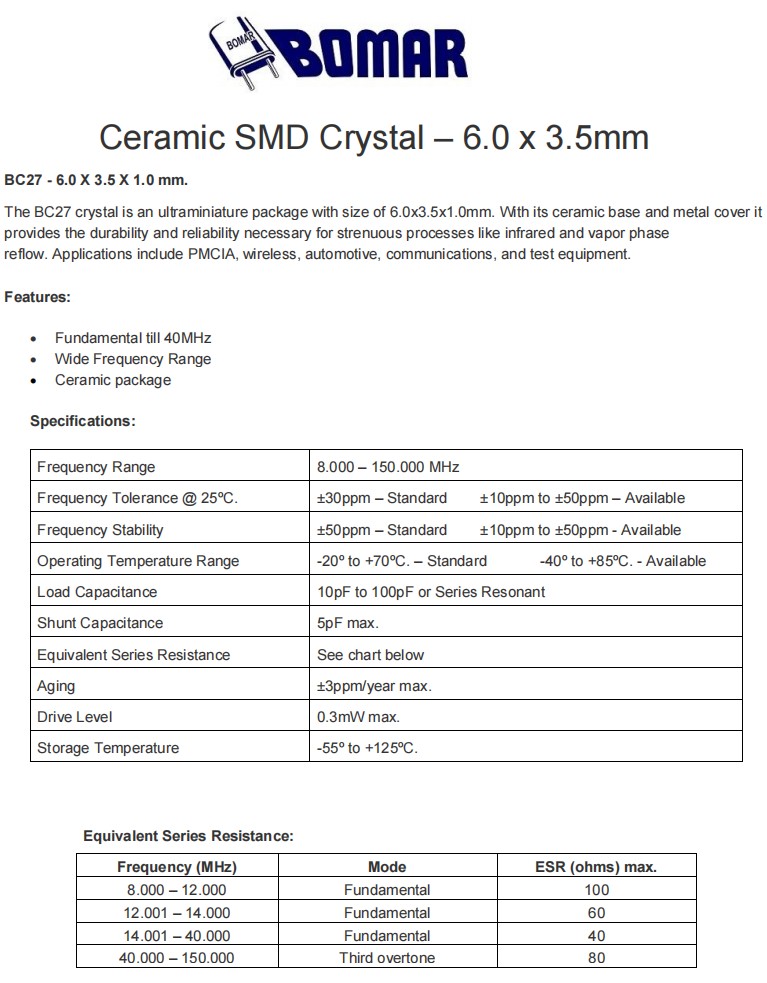 BC27EFI120-40.000000,40MHz,6035mm,Bomar兩腳貼片晶振,BC27,無線應用晶振,產品特點: