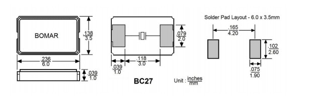BC27EFI120-40.000000,40MHz,6035mm,Bomar兩腳貼片晶振,BC27,無線應用晶振,尺寸圖