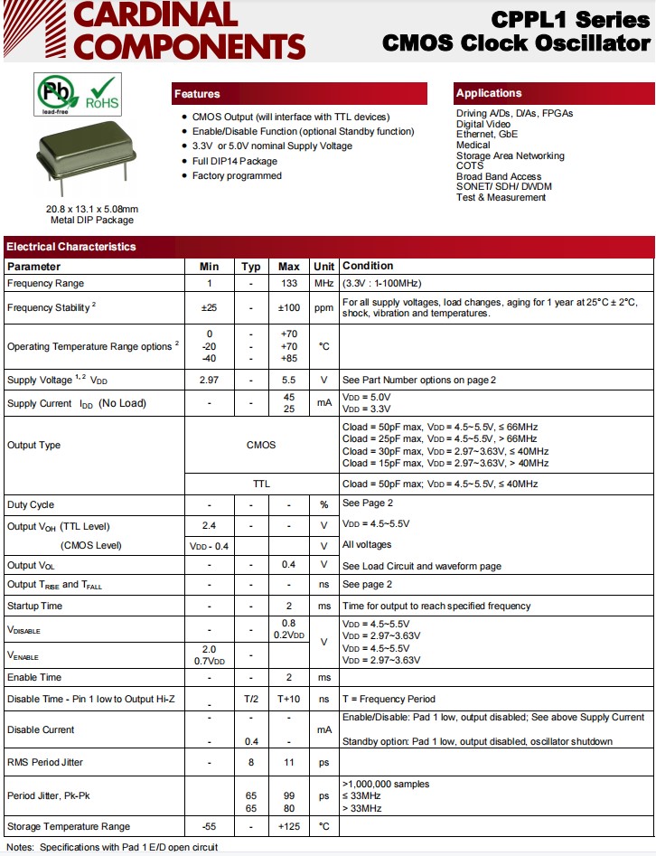 CMOS時(shí)鐘振蕩器,CPPLC1LTA7BP125.0TS,卡迪納爾石英晶振,參數(shù)表