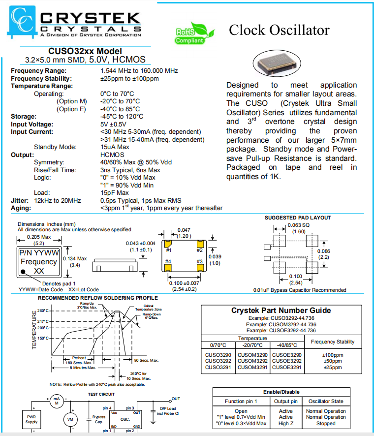 CRYSTEK晶振,CUSO32xx晶振,時(shí)鐘晶體振蕩器.有源晶振,是只晶體本身起振需要外部電壓供應(yīng),起振后可直接驅(qū)動(dòng)CMOS集成電路,產(chǎn)品本身已實(shí)現(xiàn)與薄型IC(TSSOP封裝,TVSOP封裝)同樣的1mm厚度,斷開時(shí)的消費(fèi)電流是15µA以下,編帶包裝方式可對(duì)應(yīng)自動(dòng)搭載及IR回流焊接(無(wú)鉛對(duì)應(yīng))產(chǎn)品有幾種電壓供選1.8V,2.5V,3V3.3V,5V,以應(yīng)對(duì)不同IC產(chǎn)品需要.