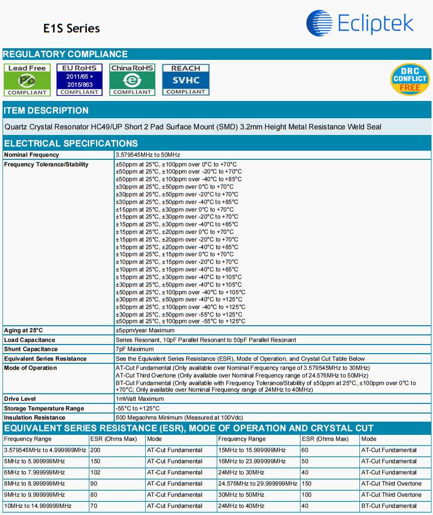 | E1SDA18-24.576M | Ecliptek | E1S | 0°C ~ 70°C | 24.576 MHz | ±50ppm | ±30ppm | 18 pF |