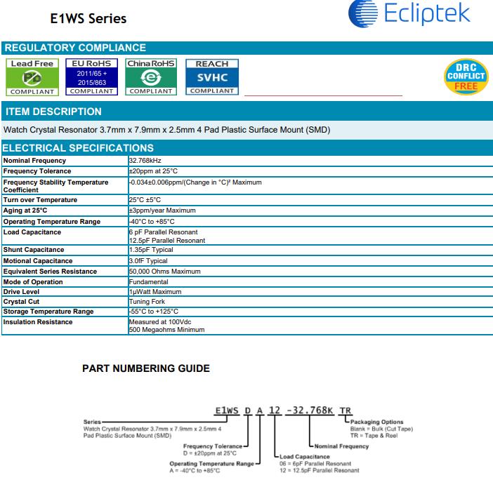 E1WS無源晶體,ECLIPTEK晶振,E1WSDA12-32.768K-TR晶振,Ecliptek日蝕晶振公司成立于1987年,是一家SMD石英晶體,貼片晶振頻率元件控制市場上公認的領導者.日蝕晶振公司擁有先進的產品和領先的技術使我們能夠為客戶提供最好的石英晶體,貼片晶振,石英水晶和有源晶振,石英晶體振蕩器,貼片振蕩器產品.