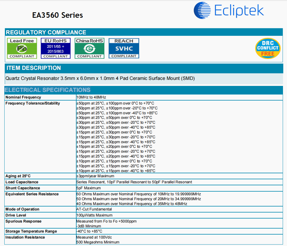 | EA5070JA18-25.000625M TR | Ecliptek | EA5070 | -40°C ~ 85°C | 25.000625 MHz | ±30ppm | ±15ppm | 18 pF |