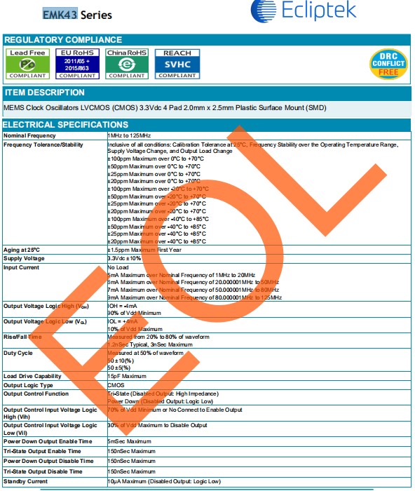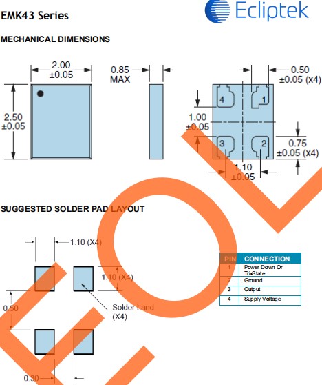 ECLIPTEK晶振,EMK43石英振蕩器,EMK43H2H-24.000M-TR晶振, 有源晶振,是指晶體本身起振需要外部電壓供應,起振后可直接驅動CMOS集成電路,產品本身已實現與薄型IC(TSSOP封裝,TVSOP封裝)同樣的1mm厚度,斷開時的消費電流是15µA以下,編帶包裝方式可對應自動搭載及IR回流焊接(無鉛對應)產品有幾種電壓供選1.8V,2.5V,3V3.3V,5V,以應對不同IC產品需要.