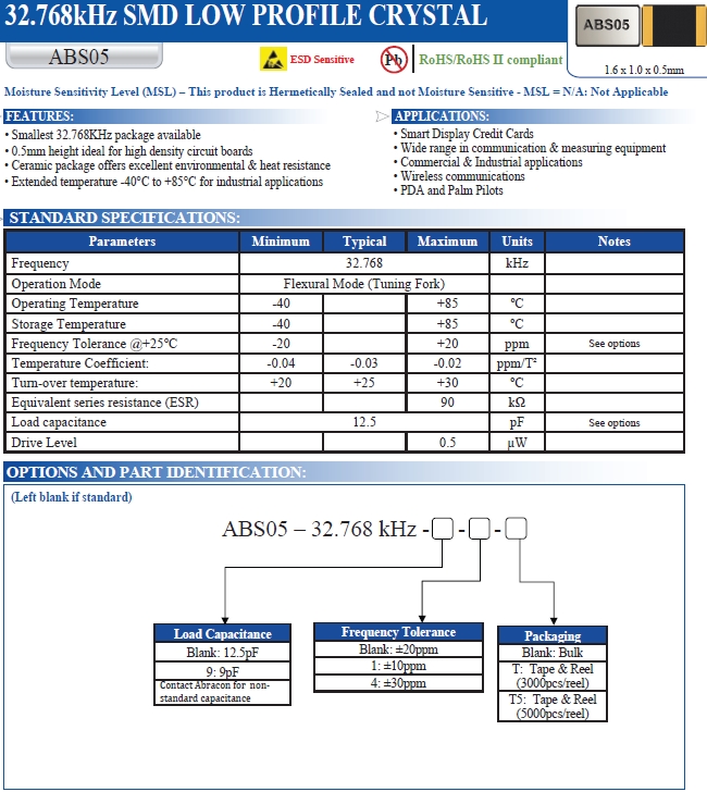 Abracon晶振, ABS05-32.768KHZ-T晶體,ABS05表晶.石英晶振外觀使用金屬材料封裝的,具有高穩定性,高可靠性的石英晶體諧振器,晶振外觀本身使用金屬封裝,充分的密封性能,可確保其高可靠性,采用編帶包裝,外包裝采用朔膠盤,可在自動貼片機上對應自動貼裝等優勢.