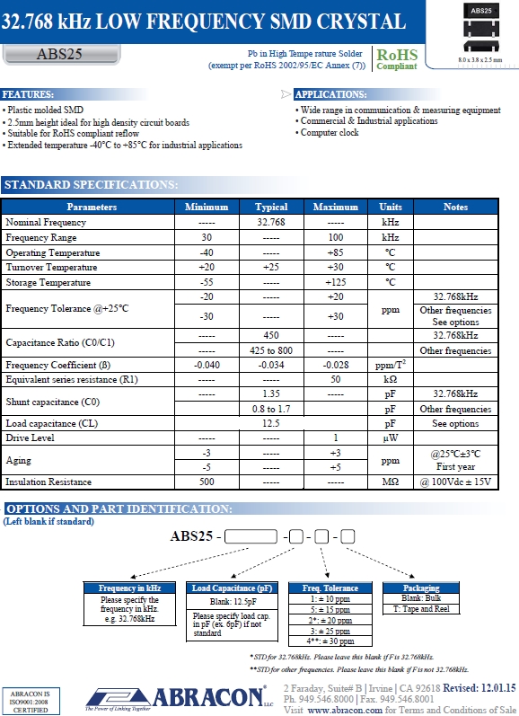 | Abracon晶振 | 單位 | ABS25晶振 | 石英晶振基本條件 |