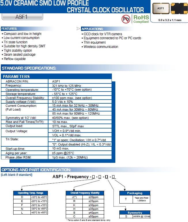 Abracon晶振,ASFL1-125.000MHZ-EC-T水晶振蕩子,ASFL1有源晶振.小型表面貼片型貼片晶振,較適合使用在汽車電子領域中,也是特別要求高可靠性的引擎控制用CPU的時鐘部分.低頻晶振可從0.32MHz起對應,小型,薄型具備強防焊裂性,石英晶體在惡劣嚴酷的環境條件下也能發揮穩定的起振特性,產品本身具有耐熱,耐振,耐撞擊等優良的耐環境特性,