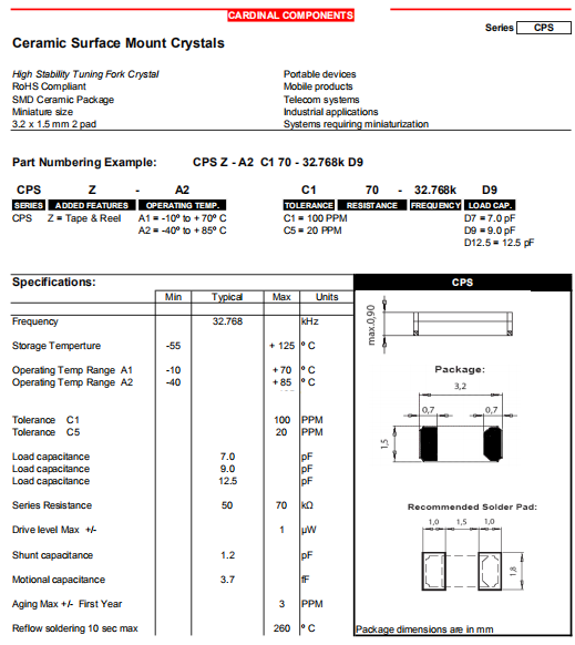 Cardinal晶振,CPS晶振,SMD石英晶體.貼片表晶32.768K系列具有超小型,薄型,質地輕的表面貼片音叉型石英晶體諧振器,晶振產品本身具備優良的耐熱性,耐環境特性,在辦公自動化,家電領域,移動通信領域可發揮優良的電氣特性,符合無鉛標準,滿足無鉛焊接的回流溫度曲線要求,金屬外殼的石英晶振使得產品在封裝時能發揮比陶瓷晶振外殼更好的耐沖擊性能.