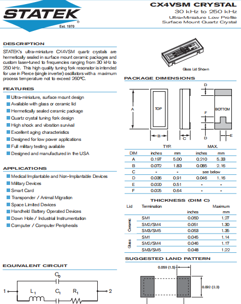 STATEK晶振,CX4VSM晶振,高品質晶振.小型貼片石英晶振,外觀尺寸具有薄型表面貼片型石英晶體諧振器,特別適用于有小型化要求的市場領域,比如智能手機,無線藍牙,平板電腦等電子數碼產品.晶振本身超小型,薄型,重量輕,晶體具有優良的耐環境特性,如耐熱性,耐沖擊性,在辦公自動化,家電相關電器領域及Bluetooth,WirelessLAN等短距離無線通信領域可發揮優良的電氣特性,滿足無鉛焊接的回流溫度曲線要求.