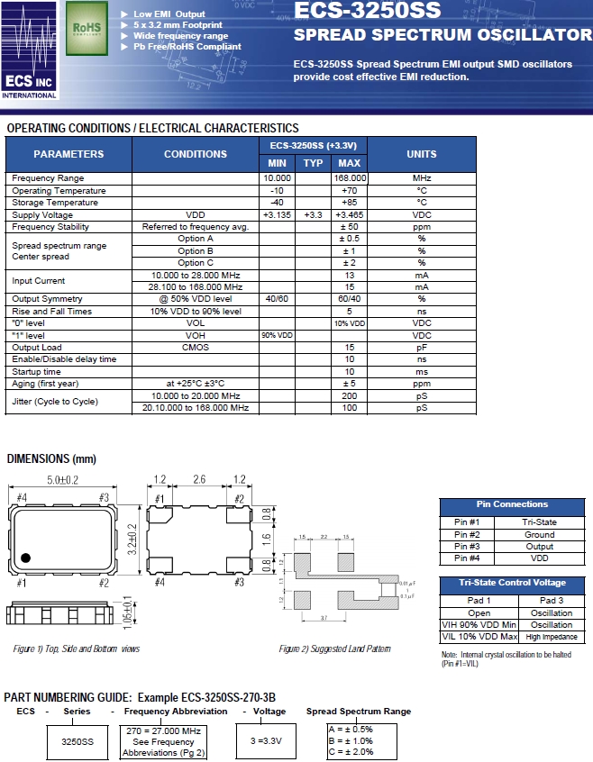 ECS晶振,ECS-3250SS-270-3B高頻晶振,ECS-3250SS Oscillator.智能手機晶振,產品具有高精度小型的表面貼片型石英晶體振蕩器,適用于移動通信終端的基準時鐘等移動通信領域.比如智能手機,無線通信,衛星導航,平臺基站等數碼產品類別,晶振本身小型,薄型具備各類移動通信的基準時鐘源用頻率,貼片晶振具有優良的電氣特性,耐環境性能適用于移動通信領域,滿足無鉛工作的高溫回流溫度曲線要求.