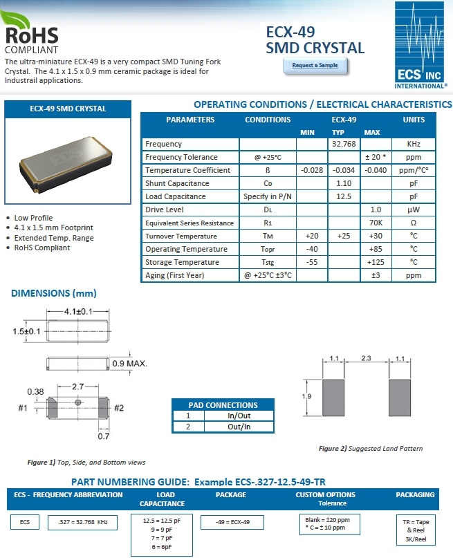 ECS晶體,伊西斯晶振,ECX-49時鐘晶振.小型,薄型,質(zhì)地輕的表面貼片音叉型晶體諧振器,手機晶體,產(chǎn)品體積小,特別適用于各種小巧的便攜式消費電子數(shù)碼產(chǎn)品,在移動通信領(lǐng)域廣泛的應(yīng)用,晶振產(chǎn)品本身可發(fā)揮優(yōu)良的電氣特性,滿足無鉛焊盤的高溫回流溫度曲線要求.