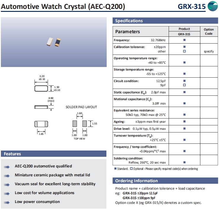 Golledge晶振,GRX-315晶振,音叉晶體.小體積SMD時鐘晶體諧振器,是貼片音叉晶體,千赫頻率元件,應用于時鐘模塊,智能手機,全球定位系統,因產品本身體積小,SMD編帶型,可應用于高性能自動貼片焊接,被廣泛應用到各種小巧的便攜式消費電子數碼時間產品,環保性能符合ROHS/無鉛標準.