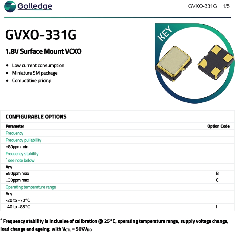 Golledge晶振,壓控晶振,GVXO-331G振蕩器.3225mm體積非常小的貼片晶振器件,是民用小型無線數碼產品的俱佳選擇,小體積的晶振被廣泛應用到,手機藍牙,衛星定位系統,無線通訊集,高精度和高頻率的穩定性能,非常好的減少電磁干擾的影響,是民用無線數碼產品較好的選擇,符合RoHS/無鉛.