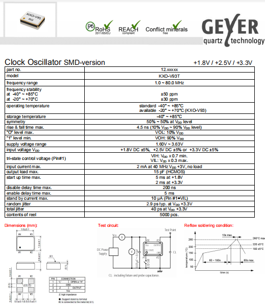 Geyer晶振,KXO-V93T晶振,高品質振蕩器.普通貼片石英晶振外觀使用金屬材料封裝的,具有高穩定性,高可靠性的石英晶體振蕩器,晶振外觀本身使用金屬封裝,充分的密封性能,可確保其高可靠性,采用編帶包裝,外包裝采用朔膠盤,可在自動貼片機上對應自動貼裝等優勢.