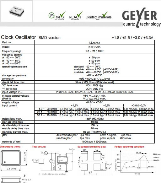 Geyer晶振,KXO-V95晶振,低功耗晶振.有源晶振,是只晶體本身起振需要外部電壓供應(yīng),起振后可直接驅(qū)動CMOS 集成電路,產(chǎn)品本身已實現(xiàn)與薄型IC(TSSOP封裝,TVSOP封裝)同樣的1mm厚度,斷開時的消費電流是15 µA以下,編帶包裝方式可對應(yīng)自動搭載及IR回流焊接(無鉛對應(yīng))產(chǎn)品有幾種電壓供選1.8V,2.5V,3V3.3V,5V,以應(yīng)對不同IC產(chǎn)品需要.