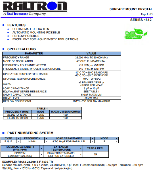 RALTRON晶振,R1612晶振,四腳貼片晶振.普通石英晶振,外觀完全使用金屬材料封裝的,產品本身采用全自動石英晶體檢測儀,以及跌落,漏氣等苛刻實驗.產品本身具有高穩定性,高可靠性的石英晶體諧振器,焊接方面支持表面貼裝,外觀采用金屬封裝,具有充分的密封性能,晶振本身能確保其高可靠性,采用編帶包裝,可對應產品應用到自動貼片機告訴安裝,滿足無鉛焊接的高溫回流溫度曲線要求.