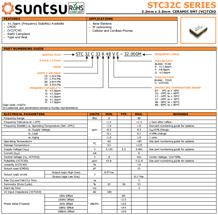 suntsu晶振,STC32C晶振,VC-TCXO振蕩器.3225mm體積非常小的SMDcrystal器件,是民用小型無線數碼產品的最佳選擇,小體積的晶振被廣泛應用到,手機藍牙,GPS定位系統,無線通訊集,高精度和高頻率的穩定性能,非常好的減少電磁干擾的影響,是民用無線數碼產品最好的選擇,符合RoHS/無鉛.