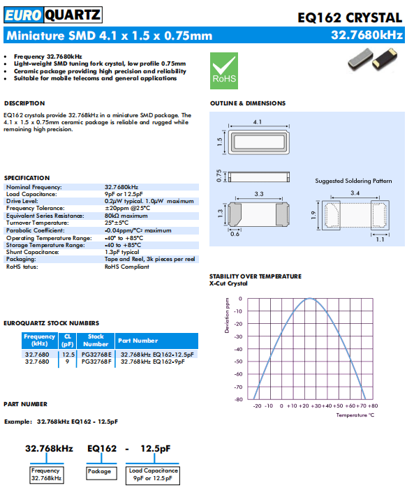 移動電信6G晶振,32.768kHz EQ162-12.5pF,EUROQUARTZ電腦主板晶振,SMD石英晶體,兩腳貼片晶振,參數表