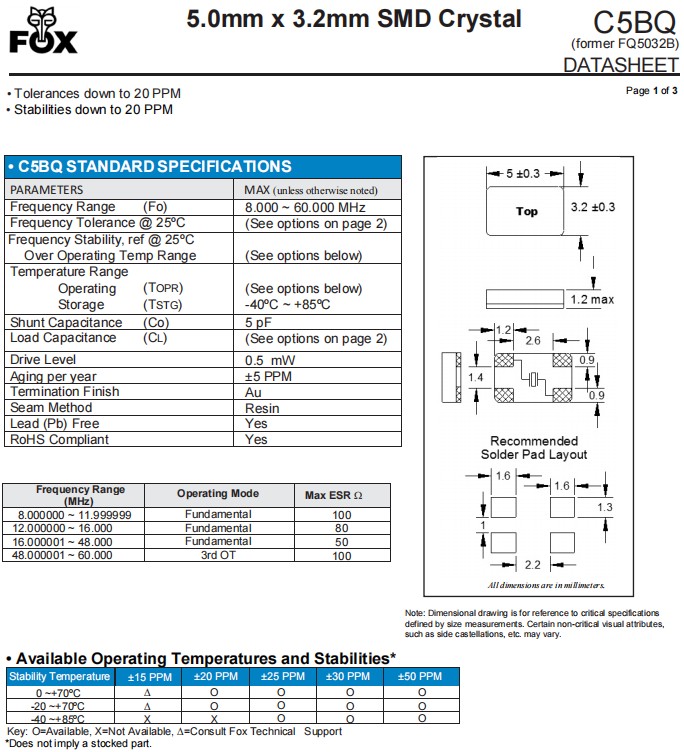 | FQ5032BR-20.000 | Fox晶振 | C5BQ | 20MHz | 4-SMD, No Lead | ±50ppm |