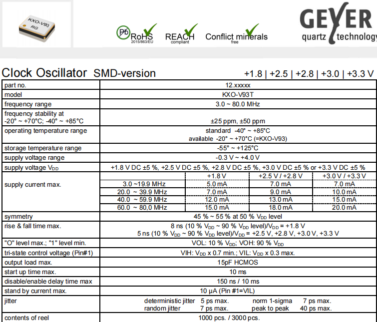 | 12.90322 | Geyer晶振 | KXO-V94T | 20 MHz | ±50ppm | 3.3V |