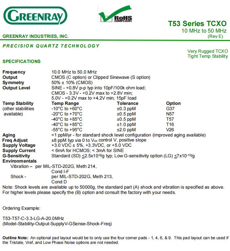 T53-T57-C-3.3-LG-A-20.0MHz,5032mm,Greenray格林雷晶振,T53,TCXO振蕩器,參數(shù)表