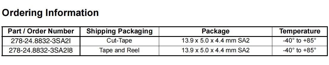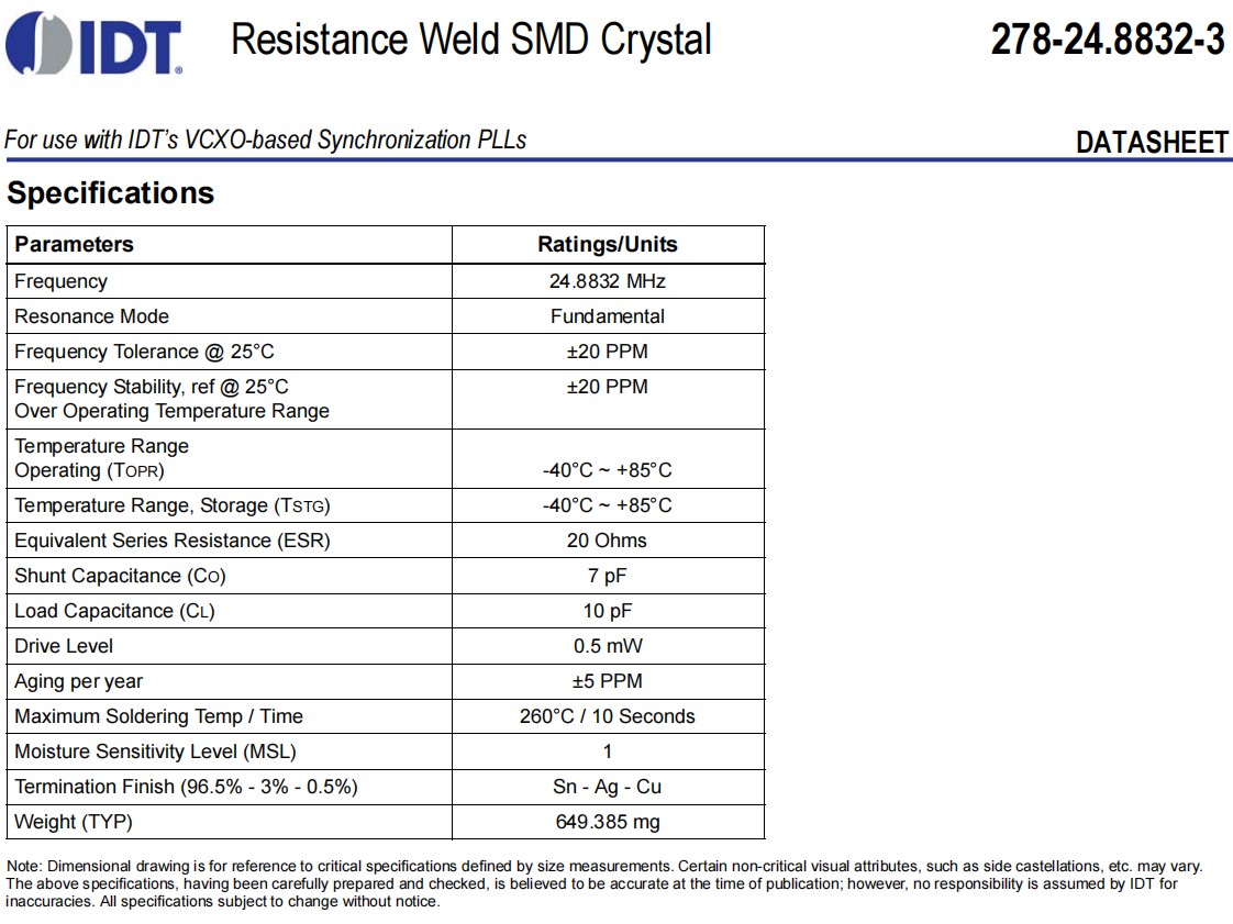 IDT艾迪悌石英晶體,278-24.8832-3SA2I8,6G藍牙模塊晶振,278-24.8832-3SA2I,無源晶振,參數表