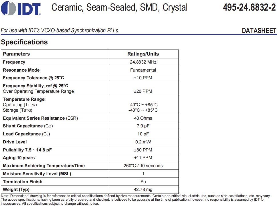 IDT石英晶振,495-24.8832-2JB4I,通訊設備6G晶振,參數表