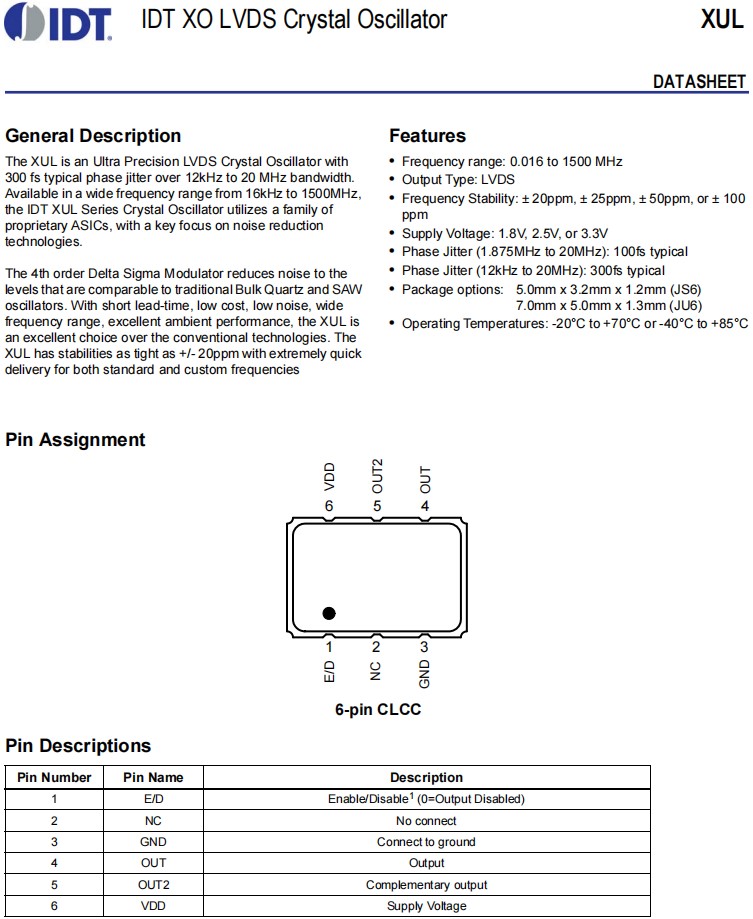 | XUL535125.000JS6I | IDT晶振 | OSC 125MHZ 進口晶振 | XUL | 125MHz | LVDS |