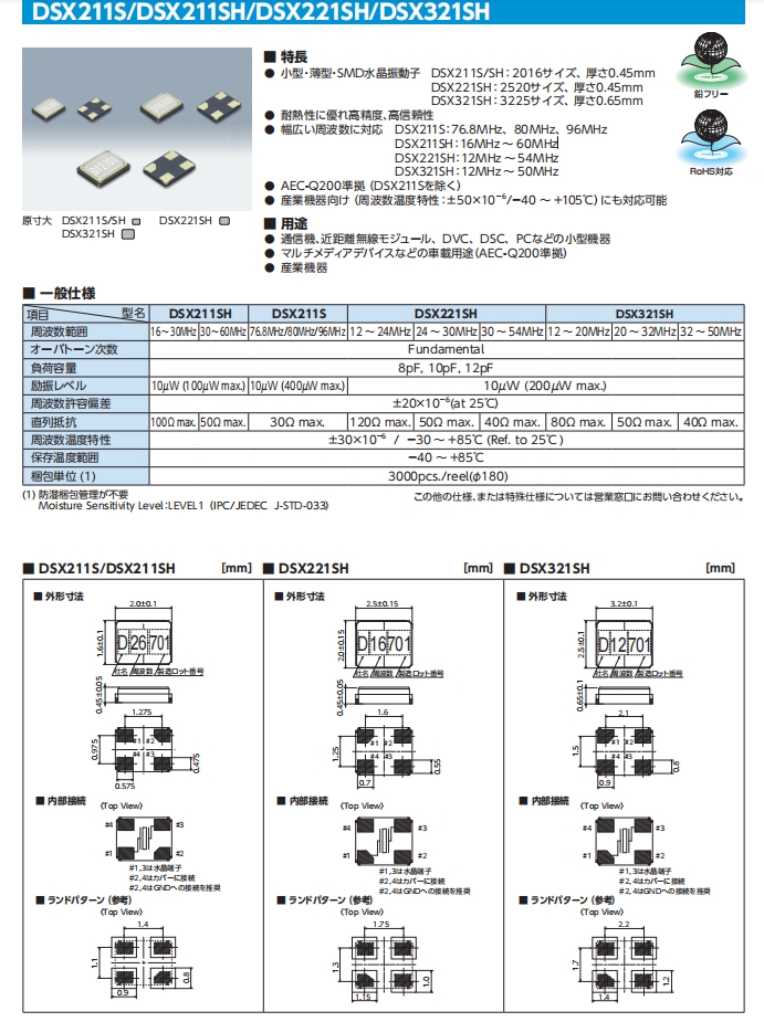 1ZNY24000BC0E 產業機器 KDS DSX321SH 24MHZ 3225mm 參數表| 項目 | 型名 | DSX211SH | DSX211S | DSX321SH | ||||