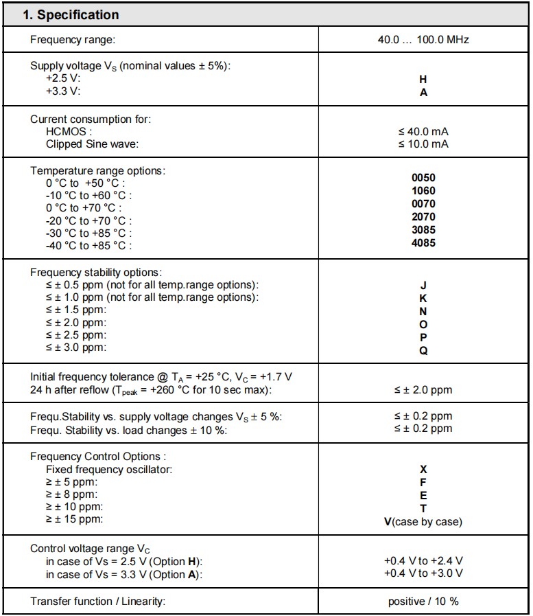 Frequency stability options: ≤ ± 0.5 ppm (not for all temp.range options): ≤ ± 1.0 ppm (not for all temp.range options): |