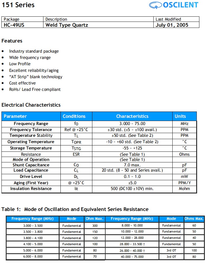 151-12.288M-SR-05KW-VS,12.288MHz,Oscilent晶振,插件晶振,石英晶振,參數表