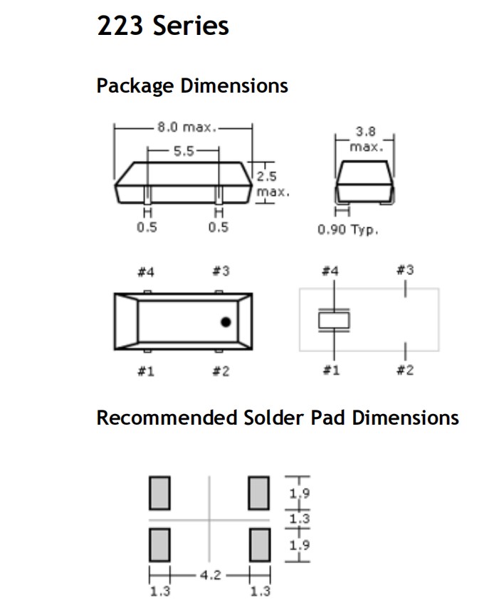 223-000312-20,32.768KHz,8038mm,Oscilent貼片晶振,SMD晶振,儀器儀表設(shè)備晶振,尺寸圖