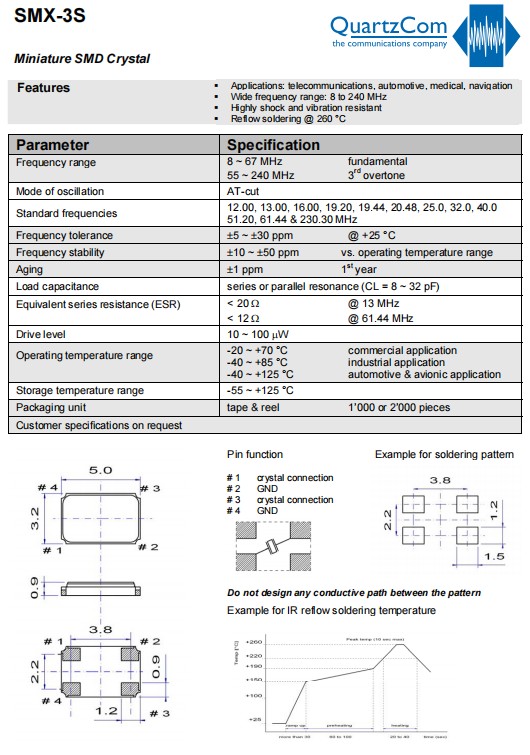 QuartzCom石英通晶振,SMX-3S四腳貼片晶振,導航6G晶振,5032mm晶振,電信應用晶振,瑞士進口晶振,QuartzCom石英通晶振,型號:SMX-3S,小體積晶振尺寸:5.0x3.2mm封裝,四腳貼片晶振,頻率范圍:8MHz~240MHz,石英晶體諧振器,無源晶振,石英晶振,SMD石英晶體,無鉛環保晶振,貼片石英晶振,工作溫度范圍:-20 ~ +70°C商業應用,-40 ~ +85°C工業應用,-40 ~ +125°C汽車和航空電子應用,高沖擊和抗振動?回流焊@ 260°C。具有超小型,輕薄型,高性能,高精度,高可靠性,耐熱及耐環境特點。應用于:電信、汽車電子、醫療設備、導航,無線網絡,藍牙模塊,航空航天,物聯網等應用。