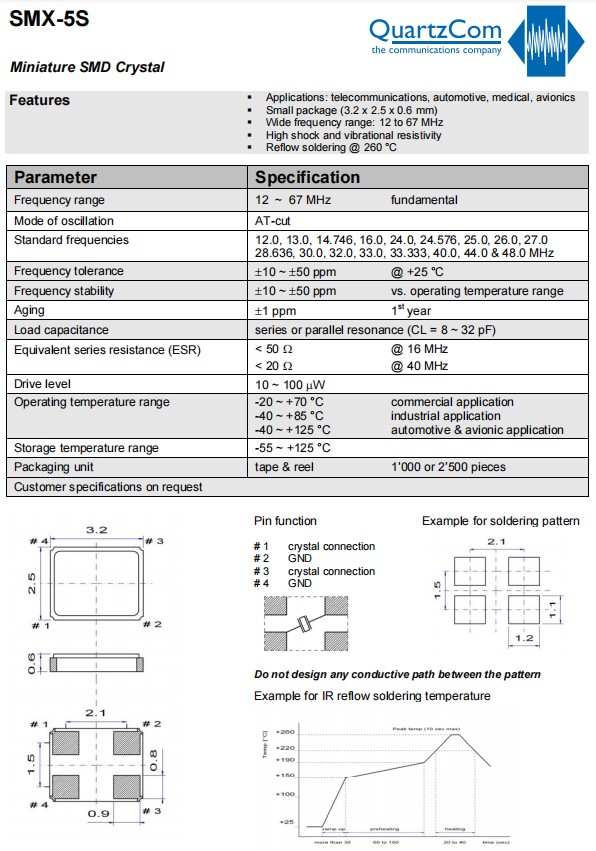汽車電子設(shè)備6G晶振,SMX-5S,QuartzCom耐高溫晶振,3225mm石英晶振,輕薄型晶振,瑞士進(jìn)口晶振,QuartzCom石英通晶振,型號(hào):SMX-5S,寬頻率范圍為:12MHz~67MHz,小體積晶振尺寸:3.2x2.5x0.6mm封裝,四腳貼片晶振,無源晶振,石英晶體諧振器,石英晶振,無鉛環(huán)保晶振,微型SMD晶體。工作溫度范圍選項(xiàng):-20 ~ +70°C商業(yè)應(yīng)用,-40 ~ +85°C工業(yè)應(yīng)用,-40 ~ +125°C汽車和航空電子應(yīng)用。3225晶振具有超小型晶振,輕薄型晶振,高沖擊和振動(dòng)電阻率,回流焊@260°C,耐熱及耐環(huán)境特點(diǎn)。應(yīng)用于:電信設(shè)備、醫(yī)療設(shè)備,航空電子設(shè)備,血壓計(jì)晶振,安防設(shè)備,商業(yè),工業(yè)等應(yīng)用。