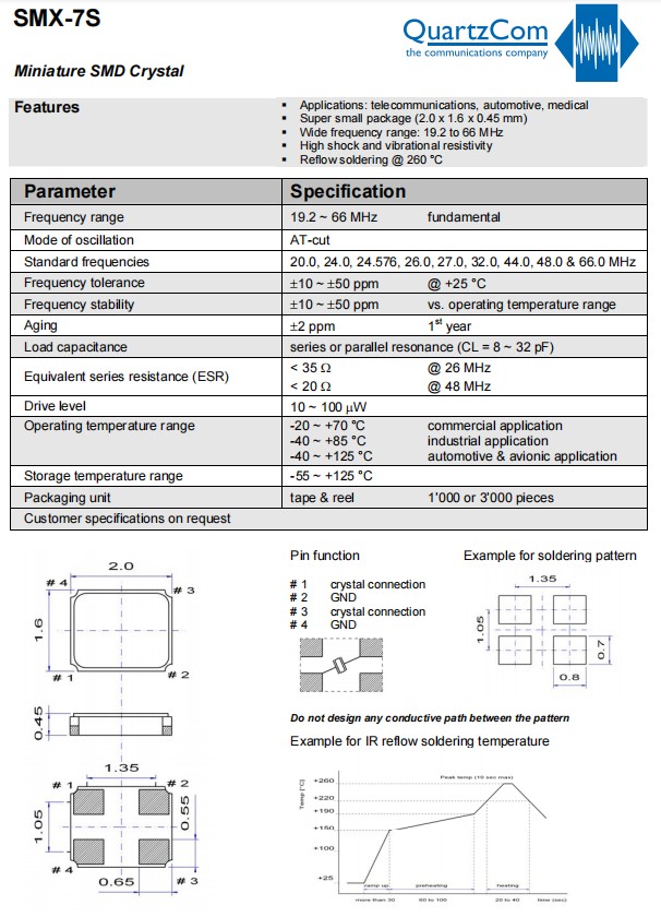 QuartzCom石英通晶振,SMX-7S,醫(yī)用設備6G晶振,2016mm晶振,微型SMD晶體,瑞士進口晶振,QuartzCom石英通晶振,型號:SMX-7S,頻率范圍為:19.2MHz~66MHz,小體積晶振尺寸:2.0x1.6x0.45mm超小型封裝,四腳貼片晶振,石英晶體諧振器,石英晶振,無源晶振,無鉛環(huán)保晶振,微型SMD晶體。具有超小型晶振,輕薄型晶振,高沖擊和振動電阻率,回流焊@260°C,耐熱及耐環(huán)境特點。應用于:智能手機晶振,電信設備、汽車電子設備、醫(yī)療設備,可穿戴設備,小型便捷式設備,平板電腦,數(shù)碼電子等應用。