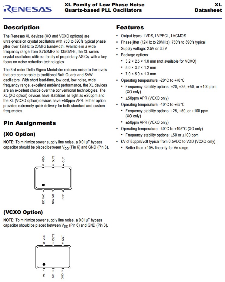 Renesas XL設(shè)備(XO和VCXO選項)是超精密晶體振蕩器,具有超過12 kHz到20MHz帶寬的典型750到890fs相位抖動。XL系列石英晶體振蕩器從0.750MHz到1350MHz到1350MHz,采用一系列專有的asic,重點關(guān)注降噪技術(shù)。三階Delta Sigma調(diào)制器將噪聲降低到與傳統(tǒng)的散裝石英和表面波紋波振蕩器相當(dāng)?shù)乃健L設(shè)備具有短、低成本、低噪聲、頻率范圍廣、優(yōu)異的環(huán)境性能,是傳統(tǒng)技術(shù)的優(yōu)良選擇。XL(XO選項)設(shè)備的穩(wěn)定性緊密為±20ppm,而XL(VCXO選項)設(shè)備的±為50ppmAPR。任何一種選項都可以為標(biāo)準(zhǔn)頻率和自定義頻率提供非常快速的交付。