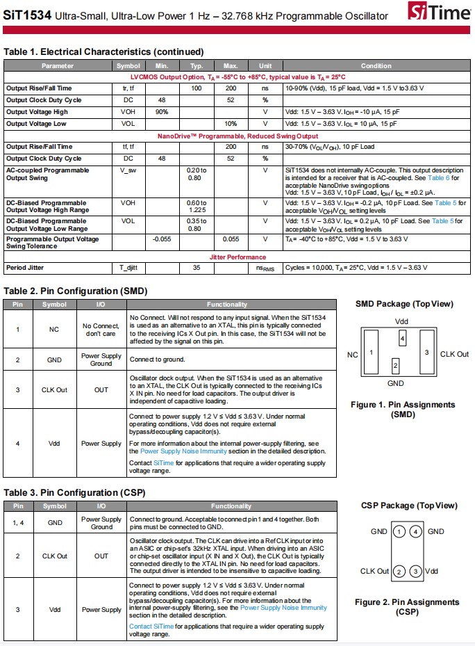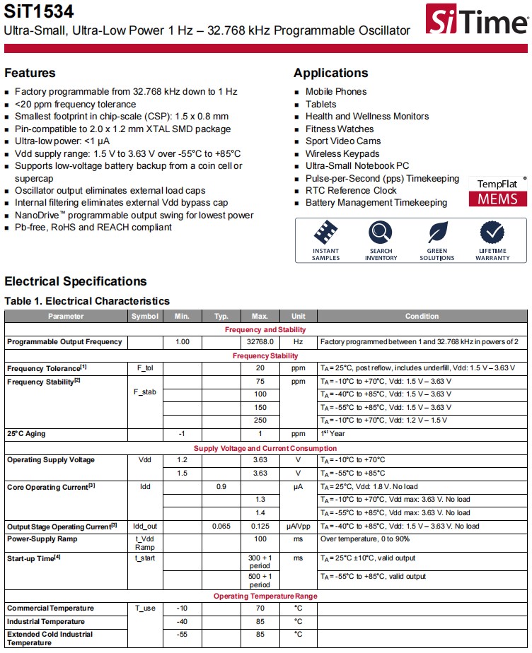 SiTime晶體振蕩器,SiT1534AI-H4-D14-32.768,健身手表6G晶振,可編程晶振,2012mm貼片晶振,參數(shù)表