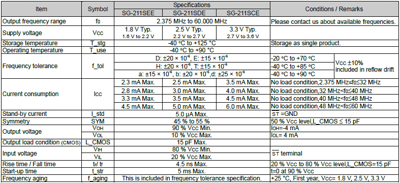 SG-211SEE,SDE,SCE振蕩器,愛普生有源晶振,“SG-211SEE 38.4000MD0”家電冰箱晶振,頻率范圍1.0MHz~60.0MHz,電源電壓3.3V,功能使能(OE),外部尺寸規(guī)格7.0×5.0×1.4mm,主要應(yīng)用領(lǐng)域:無線通訊,高端智能手機(jī),平板筆記本W(wǎng)LAN,藍(lán)牙,數(shù)碼相機(jī),DSL和其他IT產(chǎn)品的晶振應(yīng)用,三態(tài)功能,PC和LCDM等高端數(shù)碼領(lǐng)域,符合RoHS/無鉛.