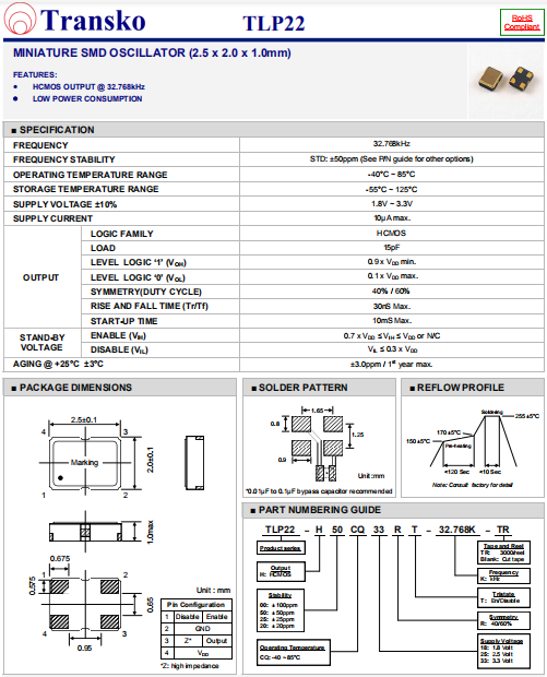 Transko晶振,TLP22晶振,貼片有源晶振.有源晶振,是只晶體本身起振需要外部電壓供應(yīng),起振后可直接驅(qū)動CMOS 集成電路,產(chǎn)品本身已實(shí)現(xiàn)與薄型IC(TSSOP封裝,TVSOP封裝)同樣的1mm厚度,斷開時的消費(fèi)電流是15 µA以下,編帶包裝方式可對應(yīng)自動搭載及IR回流焊接(無鉛對應(yīng))產(chǎn)品有幾種電壓供選1.8V,2.5V,3V3.3V,5V,以應(yīng)對不同IC產(chǎn)品需要.