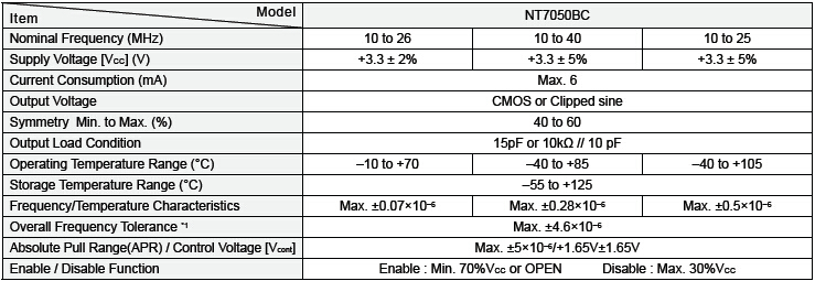 NT7050BC貼片晶振,NDK有源晶振,汽車電子產(chǎn)品晶振,采用小型封裝:7.0×5.0×2.0mm,帶有Enable/Disable(Stand-by)功能,最高工作溫度 +105°C(溫度特性± 0.5×10-6),頻率溫度特性± 0.07 × 10-6(工作溫度范圍-10 to +70°C),低消耗電流 : Max. 6mA,輸出電壓可選擇CMOS或Clipped Sine.
