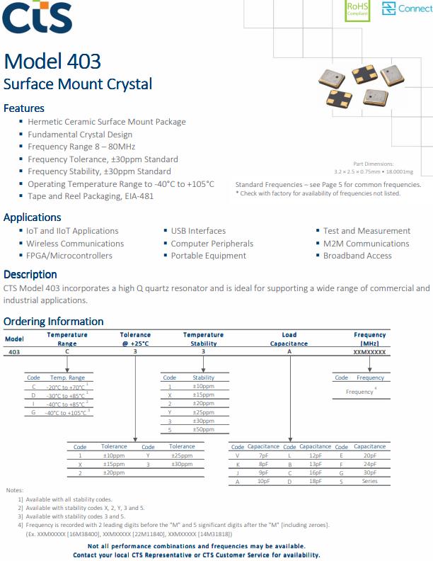 編碼403C35E27M00000,型號403,403型是一種低成本的石英晶體諧振器,廣泛用于商業(yè)應(yīng)用包括WLAN/WiMax/WiFi, A/V,藍牙,ZigBee和USB接口,筆記本電腦,電腦外圍設(shè)備,便攜式設(shè)備。特征:標準3.2mm x 2.5mm焊縫封裝基本晶體設(shè)計,頻率范圍10-60MHz,頻率公差,±30ppm標準,頻率穩(wěn)定性,±30ppm標準,工作溫度-40℃~ +85℃,穩(wěn)定的頻率過溫和驅(qū)動電平,膠帶和卷軸包裝標準,EIA-481.