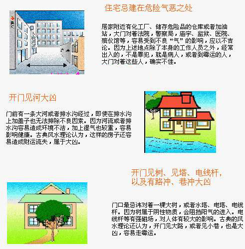 忌天斬煞。所謂“天斬煞”是指兩幢高樓大廈之間的一條狹窄空隙;因?yàn)楹孟裼玫稄陌肟諗爻蓛砂?,故此稱為天斬煞。倘若房屋面對(duì)“天斬煞”,很可能會(huì)有血光之災(zāi):空隙愈狹長(zhǎng)便愈兇,距離愈近便愈險(xiǎn)!故此宜選擇面對(duì)天斬煞的房屋居住,但若是在其背后有另一建筑物填補(bǔ)空隙則不妨。忌箭煞。“箭煞”是指住宅門外見尖銳的墻角沖射,尖引破財(cái)?shù)脑?,多與不列問(wèn)題有關(guān):因?yàn)樯眢w健康總問(wèn)題而破財(cái);被他人欺騙而破財(cái)?;返姆椒ㄒ獜摹?ldquo;天地人”著手,在門檻藏五帝錢,這是地化煞法;在門楣掛一個(gè)凸鏡,這是天化煞法;在廳拉環(huán)位置掛一用口含拉環(huán)的獸頭牌,這是人化煞法。