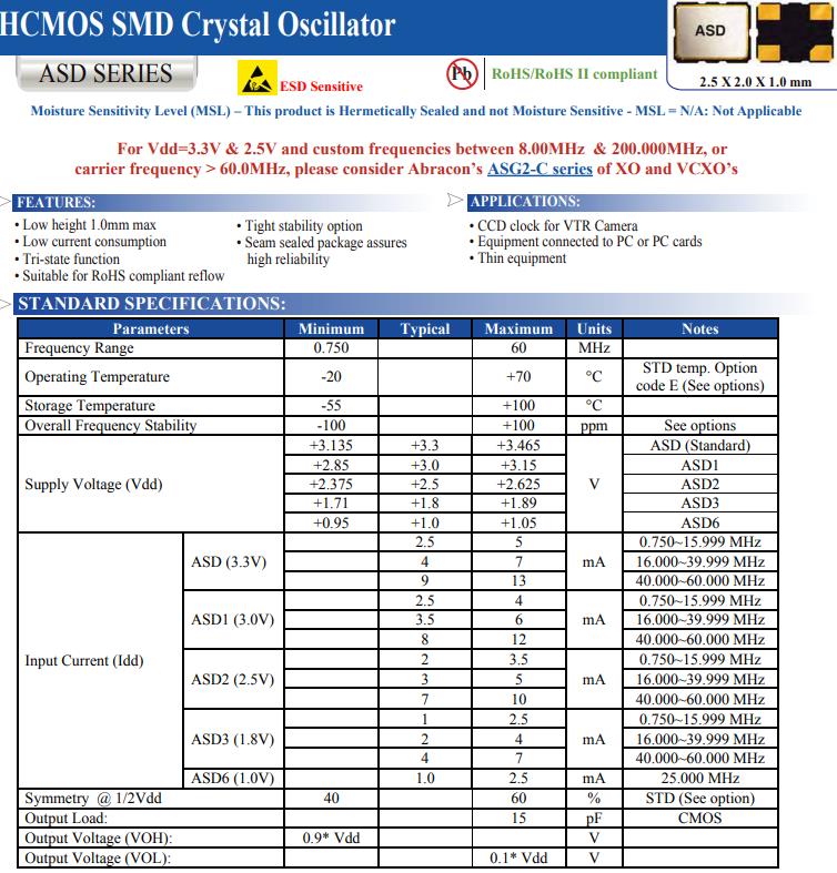 Abracon晶振公司推出了編碼ASD3-27.000MHZ-LR-T,型號ASD,OSC振蕩器,XO時鐘振蕩器, 尺寸為2520mm,頻率27MHz,輸出HCMOS,電壓1.8V,腳位4-SMD,高度低,最大1.0毫米,低電流消耗,三態(tài)功能,適合符合RoHS標(biāo)準(zhǔn)的回流,緊密穩(wěn)定性選項,接縫密封包裝,確保高可靠性,應(yīng)用:VTR攝像機的CCD時鐘,連接到PC或PC卡的設(shè)備,薄型設(shè)備.