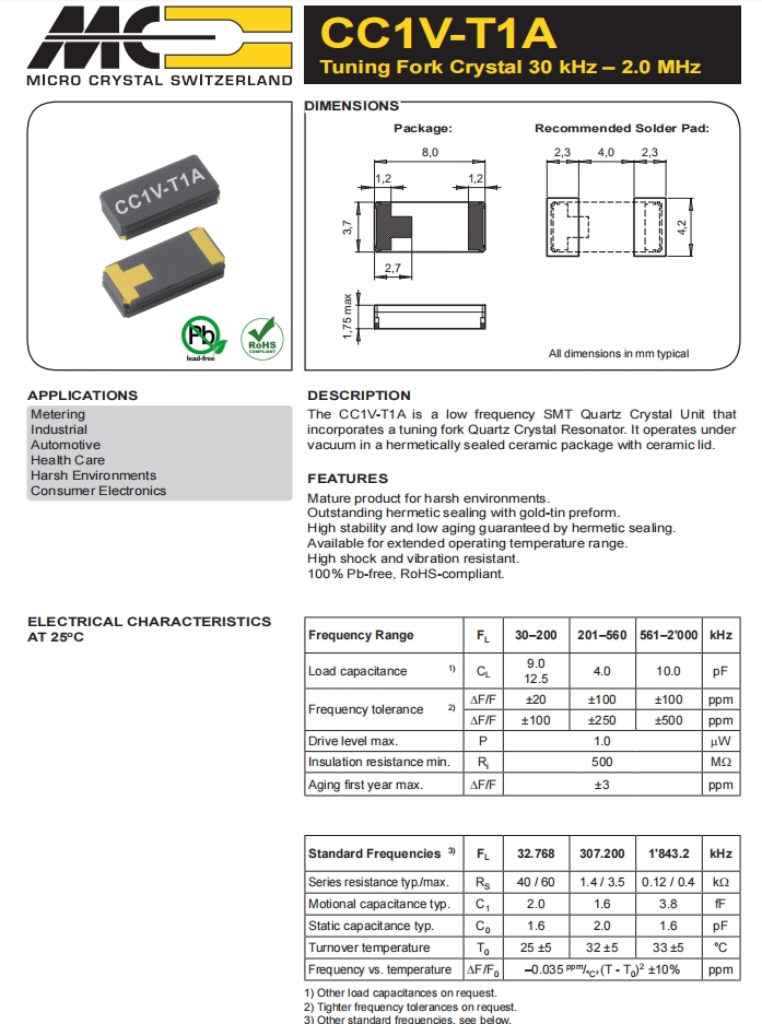編碼CC1V-T1A-32.768kHz-9pF-20PPM-TA-QC,型號CC1V-T1A,無源晶體,貼片無源晶振,尺寸為8038mm,頻率為32.768kHz,負載電容9.0pF,頻率容差+/-20PPM,工作溫度-40/+85C,CC1V-T1A是一種低頻SMT石英晶體單元結合了一個音叉石英晶體諧振器。它在真空密封陶瓷包裝與陶瓷蓋.