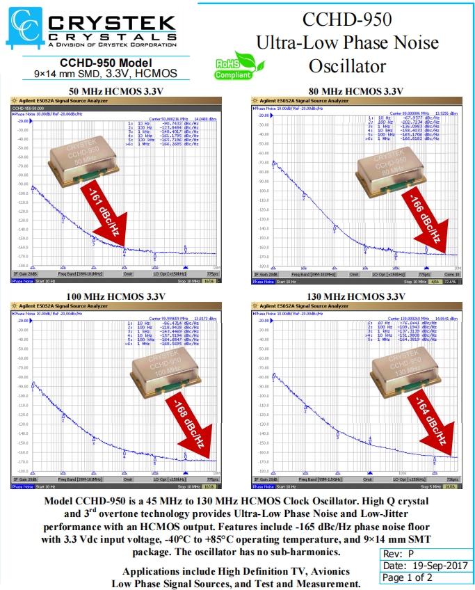 編碼CCHD-950-25-54.000,型號CCHD-950,頻率為54MHZ,頻率穩定性為25ppm,CCHD-950型號是45MHz至130MHz的HCMOS時鐘晶體振蕩器。OSC振蕩器,有源貼片晶振,高Q晶體第三泛音技術提供超低相位噪聲和低抖動性能與HCMOS輸出。特點包括-165dBc/Hz相位本底噪聲,3.3Vdc輸入電壓,-40°C至+85°C工作溫度,9*14mmSMT包中。振蕩器沒有次諧波。