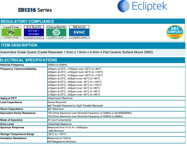 | EB3250YA12-16.000M TR | Ecliptek晶振 | CRYSTAL 16.0000MHZ 12PF SMD | -40°C ~ 125°C |